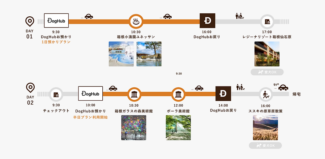ユネッサンで遊んだ後にポーラ美術館へ。8時間あれば2つ以上の観光スポットを巡れます。DogHubは仙石原の中心に位置しているので、移動もスムーズです。